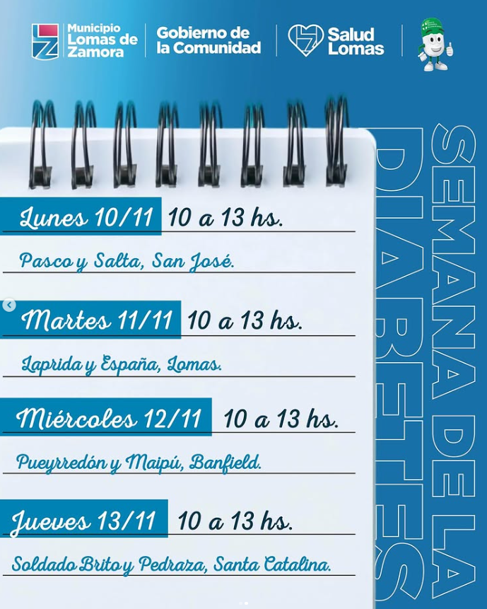 La Secretaría de Salud de Lomas de Zamora iniciará el proximo lunes una serie de actividades gratuitas de concientización por la Semana Mundial de la Diabetes. Los encuentros, organizados en conjunto con el Colegio de Farmacéuticos del distrito, tienen como objetivo que los vecinos conozcan los riesgos, los signos de alerta y los tratamientos adecuados de esta afección.