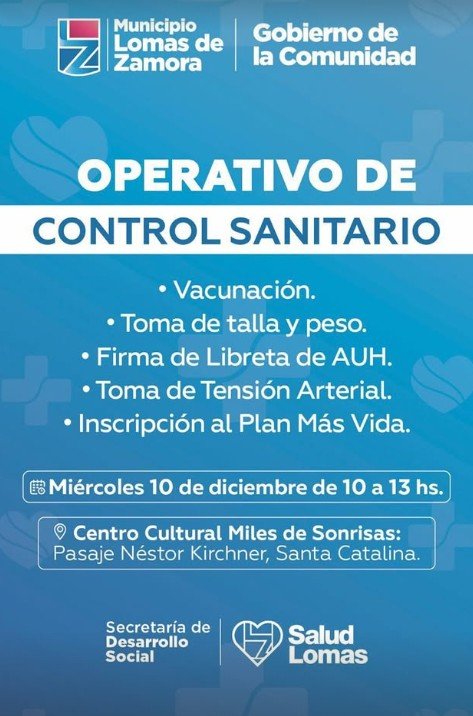 El Municipio de Lomas de Zamora llevará adelante una nueva jornada de salud y control sanitario el próximo martes 10 de diciembre, de 10 a 13 horas. El operativo se desarrollará en el Centro Cultural Miles de Sonrisas, situado en el pasaje Néstor Kirchner, en el barrio de Santa Catalina. La actividad es organizada por la Secretaría de Desarrollo Social y Salud Lomas con el propósito de facilitar el acceso a prestaciones médicas básicas para los vecinos de la zona.